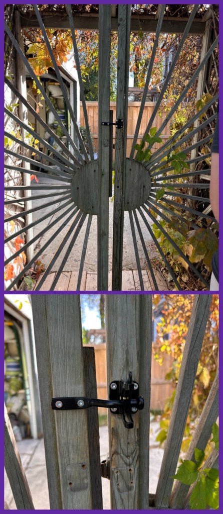 then I had the brilliant idea of using the old fastener to hook the one door to the pergola instead of using a bungee cord to keep the gate open when expecting company or moving large things through the space… the second door has always just happily leaned against the garage when opened, lol…