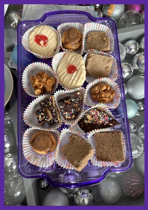 big girl pants, blessed, Christmas, delicious, friends, fun, garden, good times, goodies, moments, neighbour, purple, trays, treats, widow