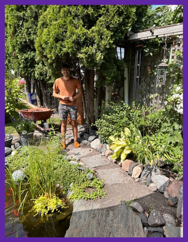 he removed some miscellaneous rocks, dug a trench and then, with my oldest grandson, moved and placed large rocks, which were located all around the garden…