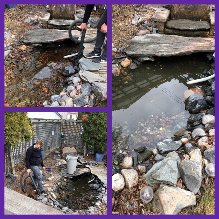 even though it was chilly and overcast my grandson arrived this morning to clean up the pond… it was filled with a ton of decaying leaves…