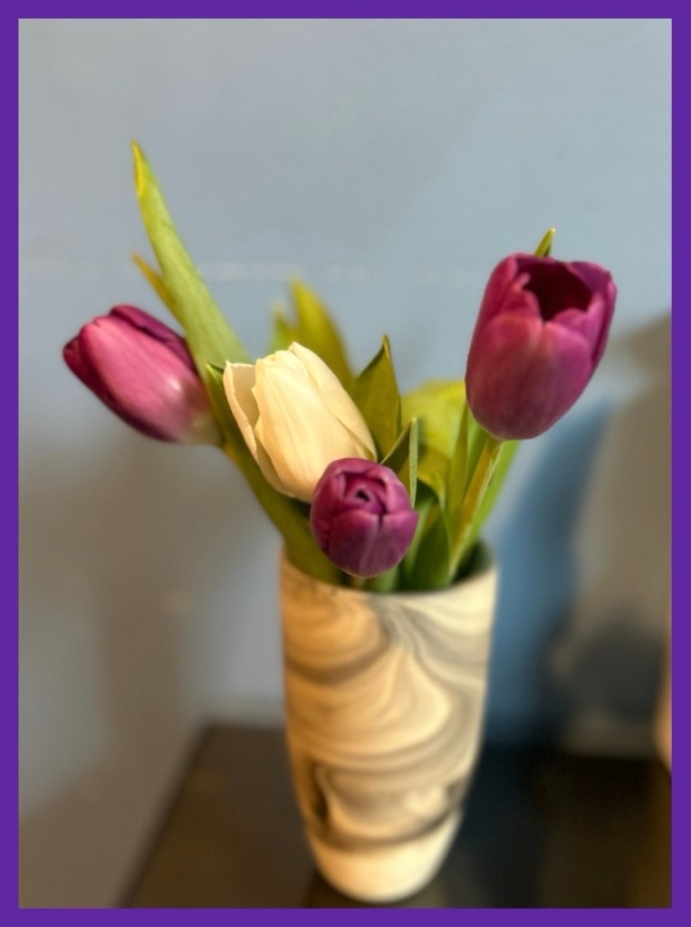 big girl pants, blessed, doldrums, flowers, happy, home, moments, purple, tulips, vases, weather, widow