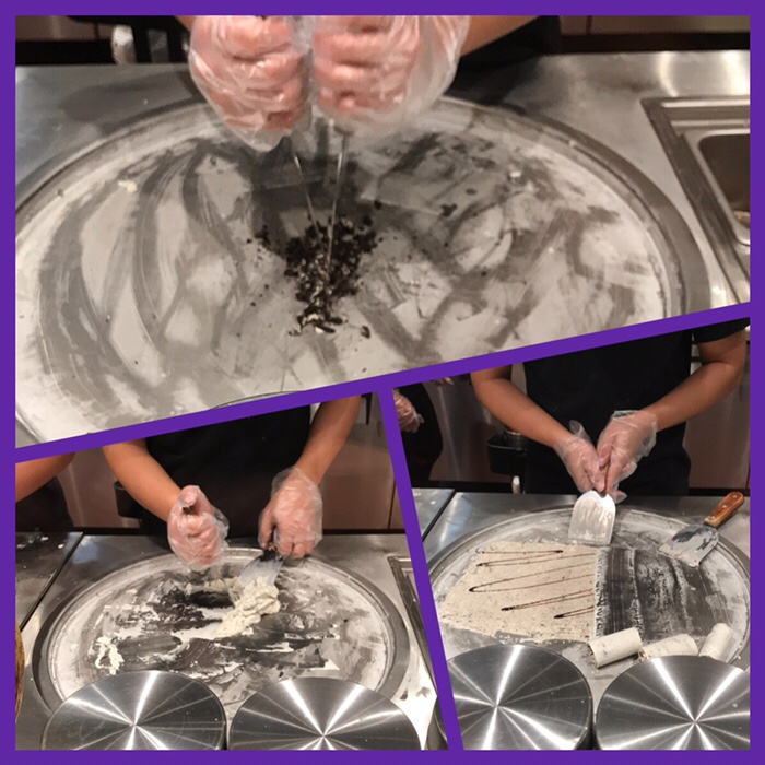 it was quite a show… they chop up the main ingredient, then they pour cream onto the cold metal tray… they move it around, flatten it and then roll it into fat tubes… pop it into a container, add whipped cream, a few toppings, and voila… a delicious treat;-)…