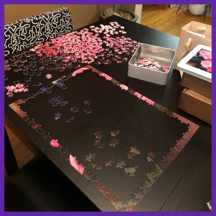 we ended the day working on the puzzle I ordered quite some time ago – which I hadn’t been able to connect the edge pieces, so I had packed it up and put it away in disgust…