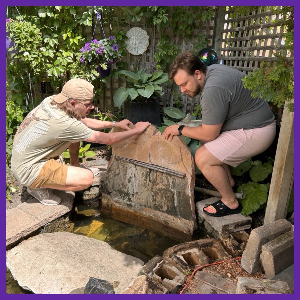 with help from a friend the main piece of the waterfall rock was carefully lowered back into its spot…