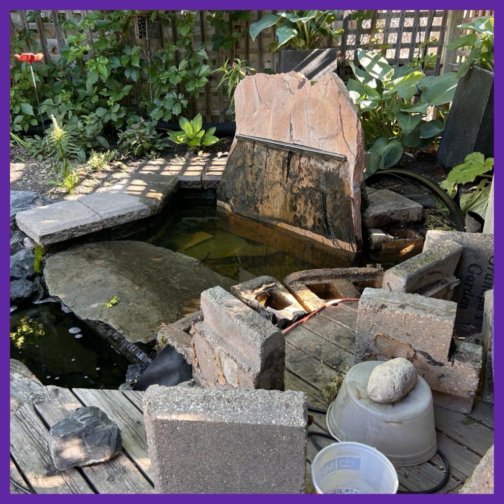 the work on the pond waterfall area started in early June… when the first two fixes didn’t work we moved on to more serious attempts…