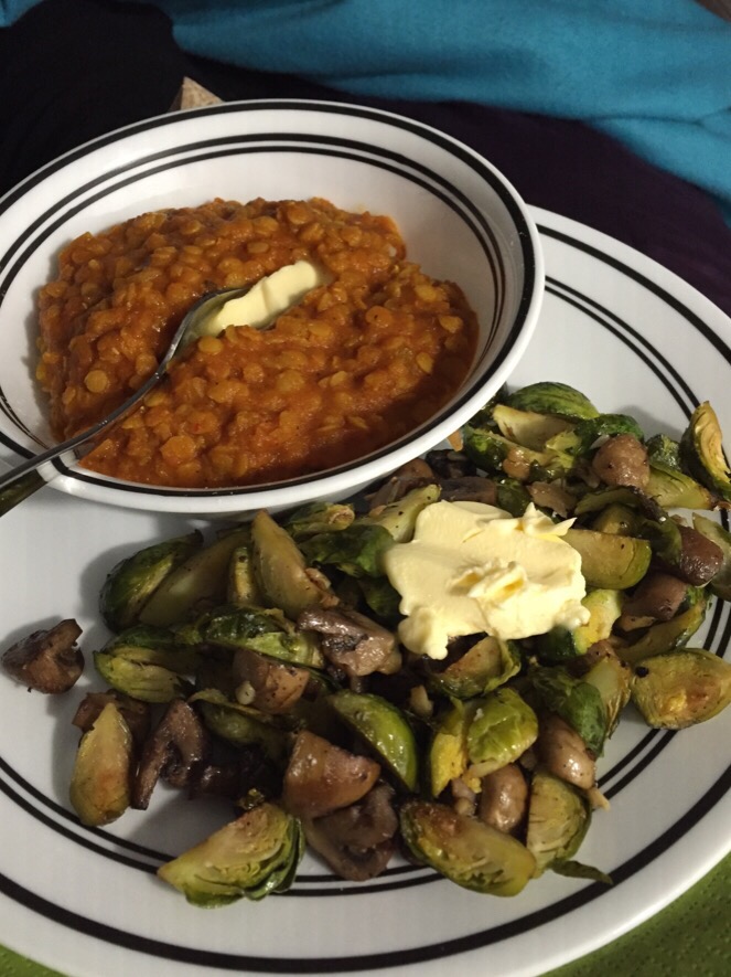 then my grandson met me at the office and came to shovel… afterwards we had leftover lentils with brown basmati rice along with roasted brussel sprouts and mushrooms…