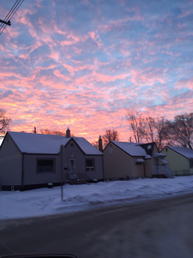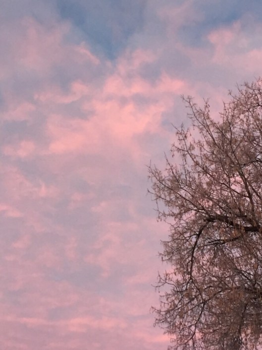 on my way out to the car this morning — with my hands full of various bits and bags for work — I had to stop and take a picture of the pink sky…