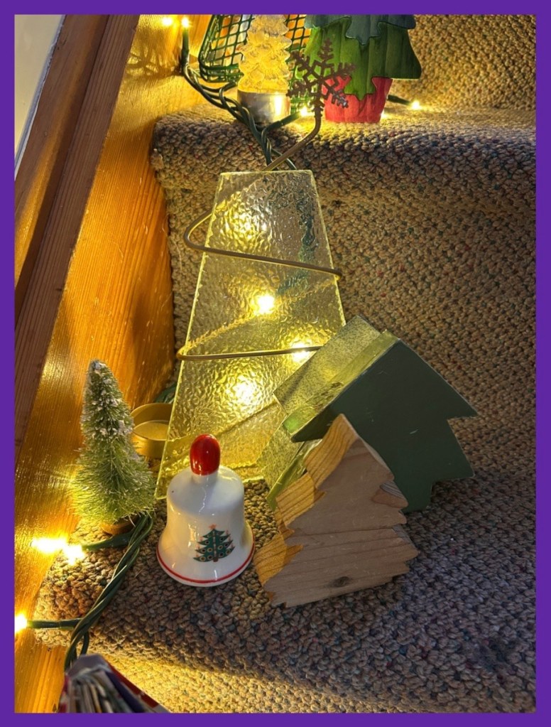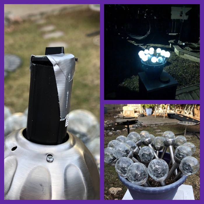 it is now in the sleigh with some of the snow people and it seems to be doing okay… I added some of the solar lights in and around the melt (group of snow people)… I kind of like it…