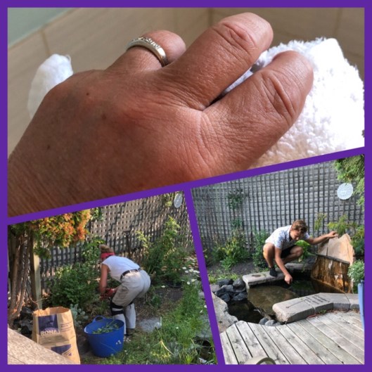 today, I tried to clean the pump as it was clogged… I couldn’t lift it out of the pond, so I put one of my chair cushions on the deck and laid on it while pulling out the gunk… turned the power back on and there was a fair bit of water coming from the top of the pump… turned it off and pushed the pieces together after a conversation with my son-in-law… turned it back on again and all of a sudden the hose popped off and there was water spraying everywhere, lol…