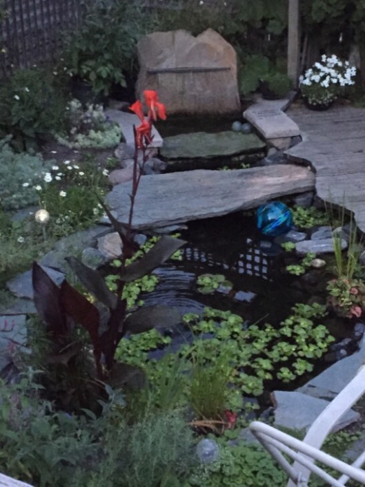 the pond tonight… waterfall is not running, not sure why, but my son-in-law is coming tomorrow morning to see if he can figure it out…