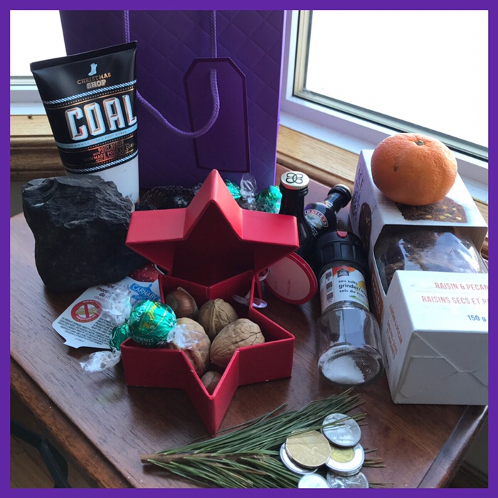 my bag held a candy cane, heel of bread, an orange, 3 pieces of charcoal, a little bottle of Baileys, and a cookie…