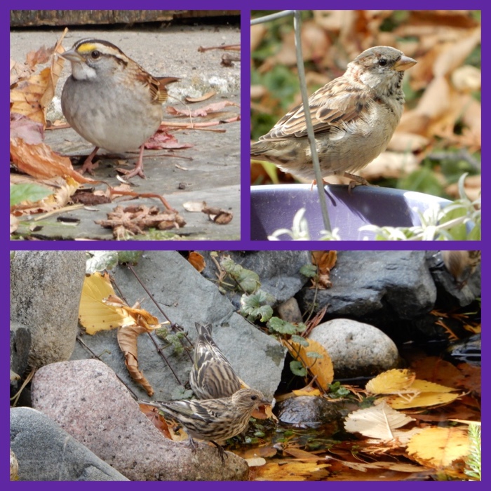 big girl pants, birds, blessed, crunch, Fall, garden, leaves, listen, moments, nature, noise, photos, pine siskins, pond, widow