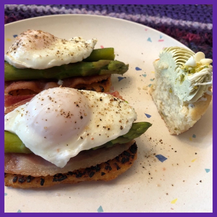 made poached eggs on potato patties, with bacon and asparagus… and I had it on my confetti plate… ended breakfast with half of a delicious pistachio cupcake which a friend dropped off for me yesterday…. nice start to the day…