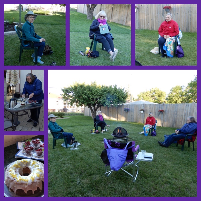 we sat – physically distancing, of course – around a lovely fire in our host’s backyard, celebrating another birthday and enjoyed a visit while eating lemon cake with fresh raspberries which she had baked for us… (cake photo from the chef)…