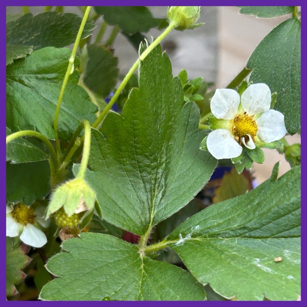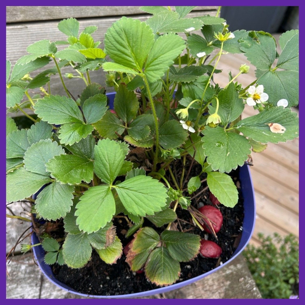the strawberry that had gone into the ground in the fall has moved into a pot and has quite a few blossoms on it… as well as the beginnings of berries…