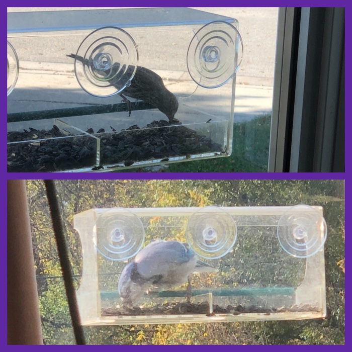 so far there have been chickadees, house finches, nuthatches, and blue jays… I had hoped to be able to take photos but the plastic distorts the pictures…