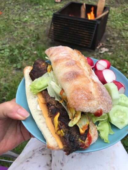 traffic wasn’t too bad and we arrived to find the pop-up camper ready and the three guys around the fire… for supper we had burgers on ciabatta buns and veggies…
