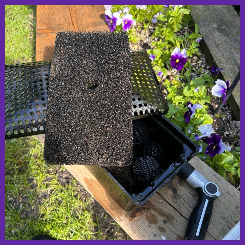 it was very dirty, ugh… the process of getting in and out of the pond involves a chair, towel, watershoes, and this time, a bucket to put the bits that needed to be cleaned…