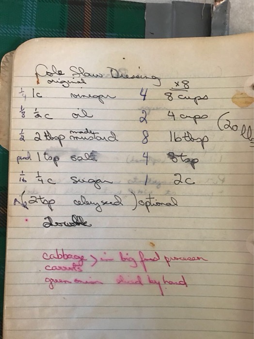 today I made coleslaw from a recipe I received from a matriarch of the church over thirty years ago… the recipe is written for a huge crowd…