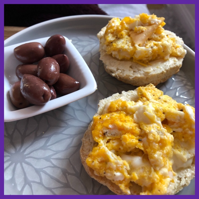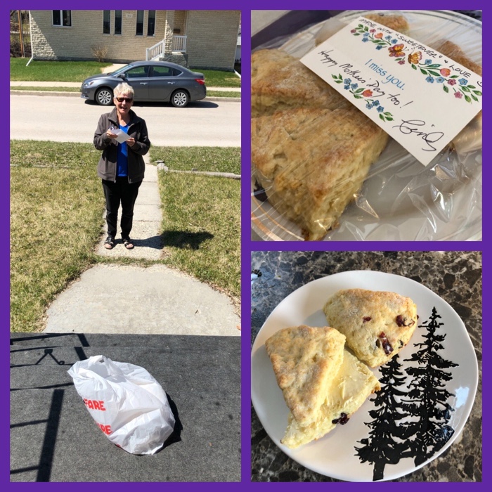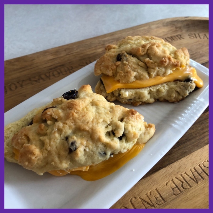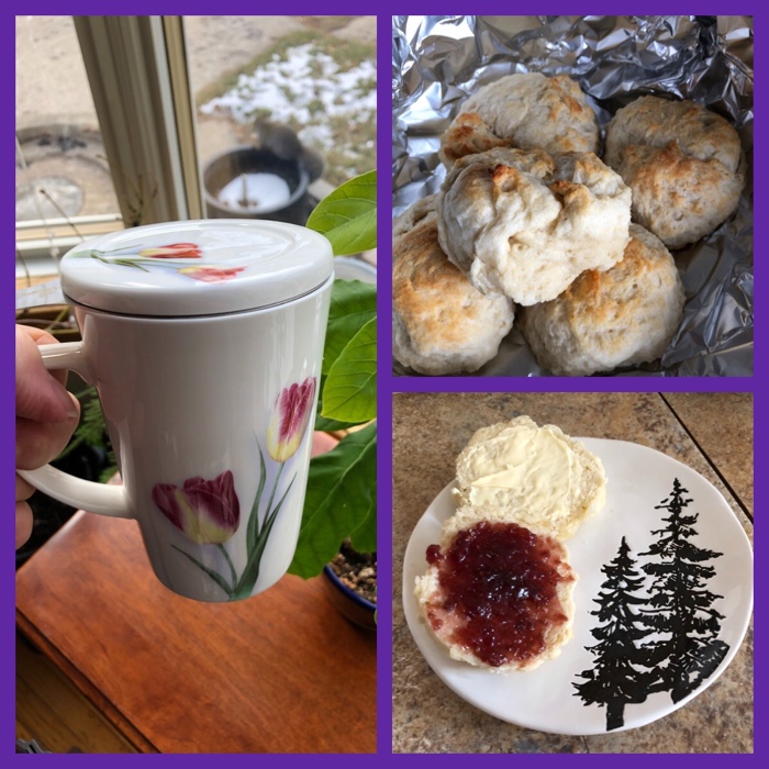 had to call her a few times to clarify what to do, lol… pulled out my Purity cookbook to review steps…my BS buddies came by and they were able to provide a few more bits of info… baked them at 450 instead of the 400 noted on the card… they came out great… so busy I never even got a picture of them other than this one which I ate with the amazing chocolate raspberry jam that we picked up when I was in southern Ontario…