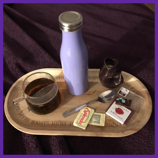 got out my special cup, filled up my Bino with extra hot water, put milk in my cute little purple whale jug and found a few pieces of chocolate to go with everything and put it all on my new tray…