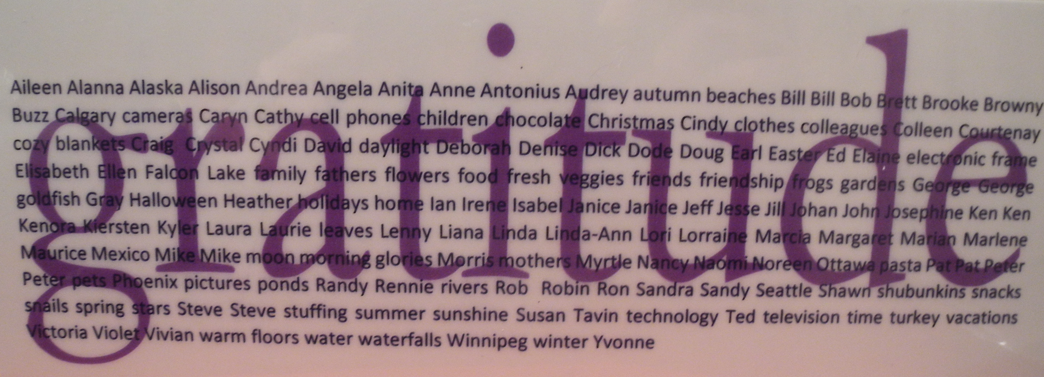 I spent time thinking of some of the things I am grateful for, as well as the people who fill my life… made a list of all those and put them in alphabetical order and produced a bookmark with the word gratitude and all of the things/people…