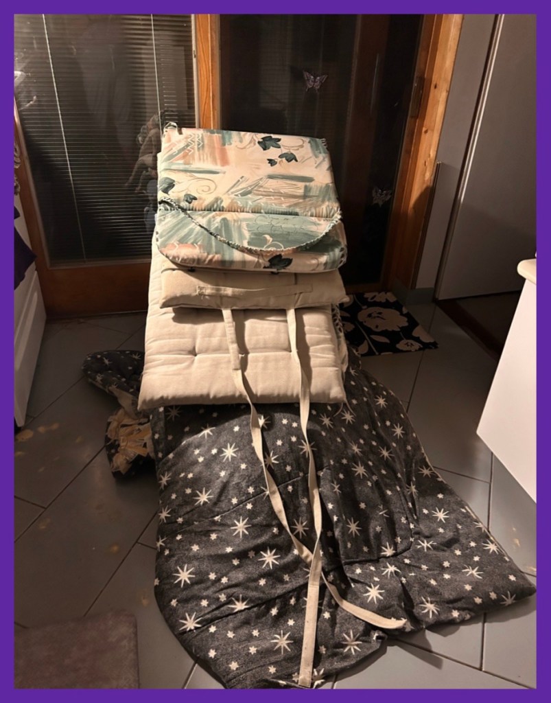 around 4:30 am drops began to land on me😳, and shortly thereafter all of the paraphernalia was on the kitchen floor and I headed upstairs to my bed, lol…
