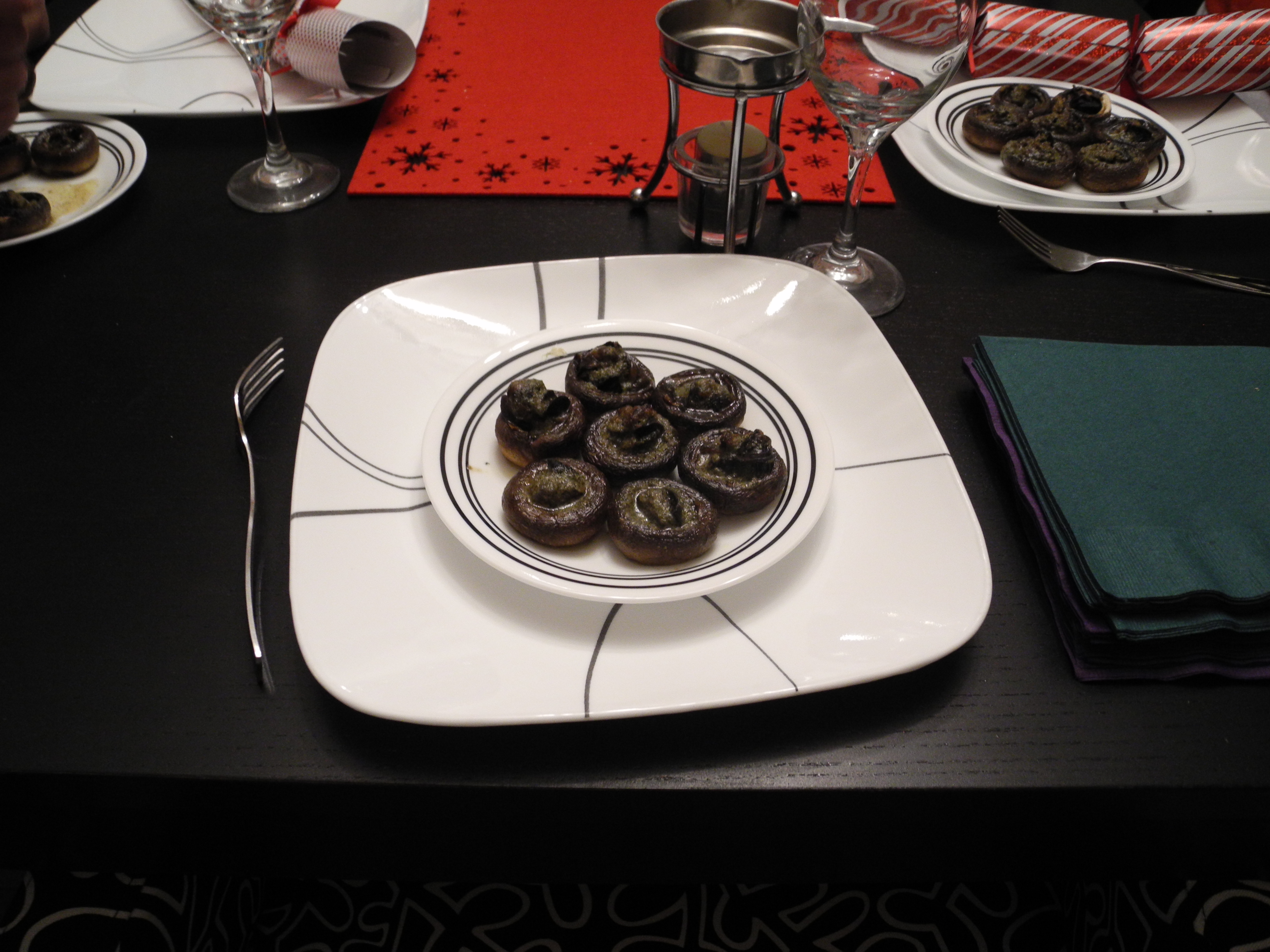 there is a fairly set menu for New Year’s Eve… escargot in mushroom caps followed by steak and lobster… this year we also had Caesar salad and twice stuffed potatoes…