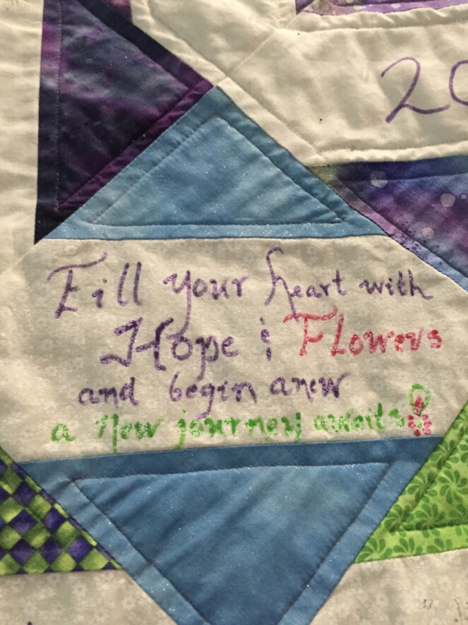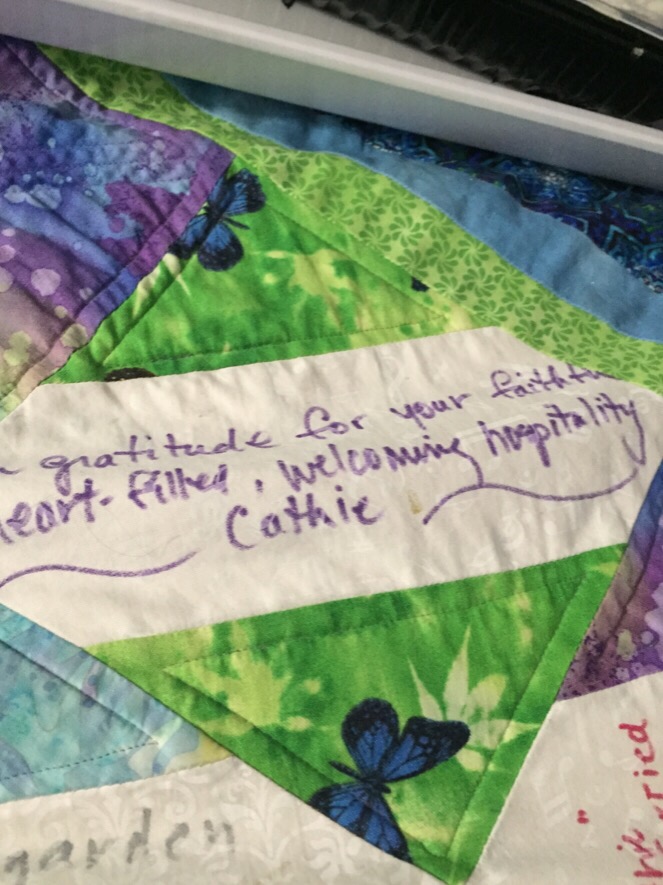 it began as pieces of fabric which individuals wrote on at the party given for me after I left my last job… from there a small group of amazingly talented women spent time piecing together the fabric and putting a border around it and backing the whole thing…