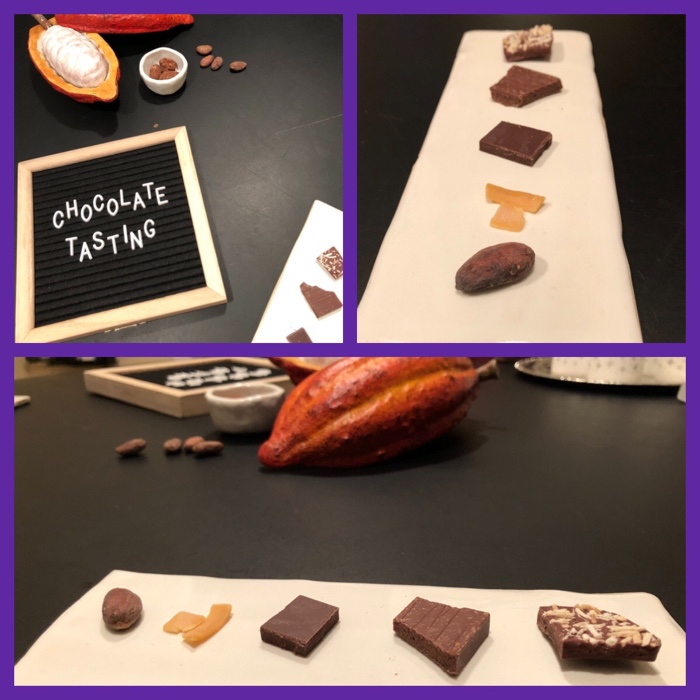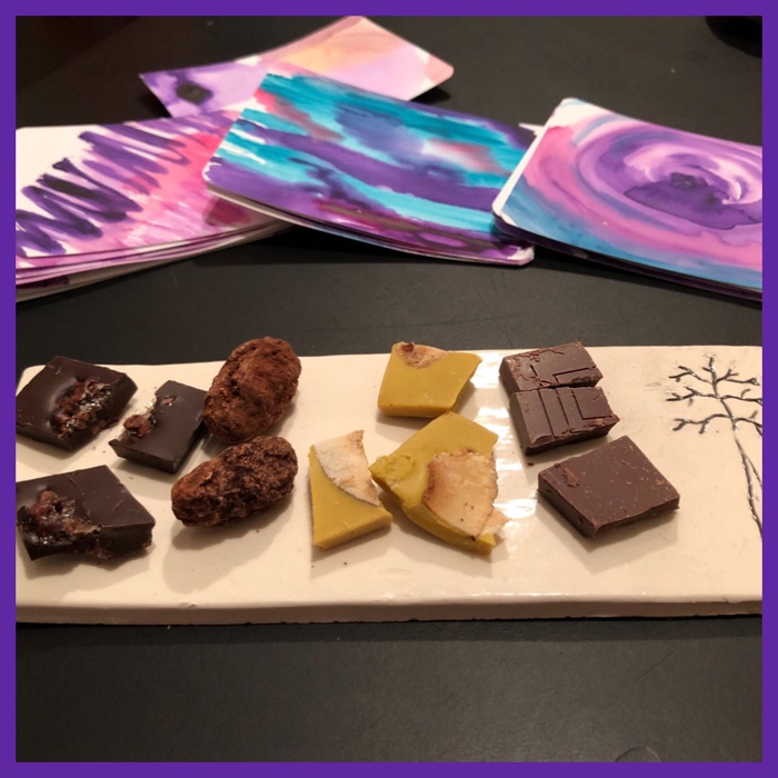 this one was certainly different… I didn’t think to put them on a pretty plate, but did have them lined up and with the note pages… in the end I felt very happy and enjoyed what I had learned… she really helped me discover the different notes of the five pieces of chocolate;-)…