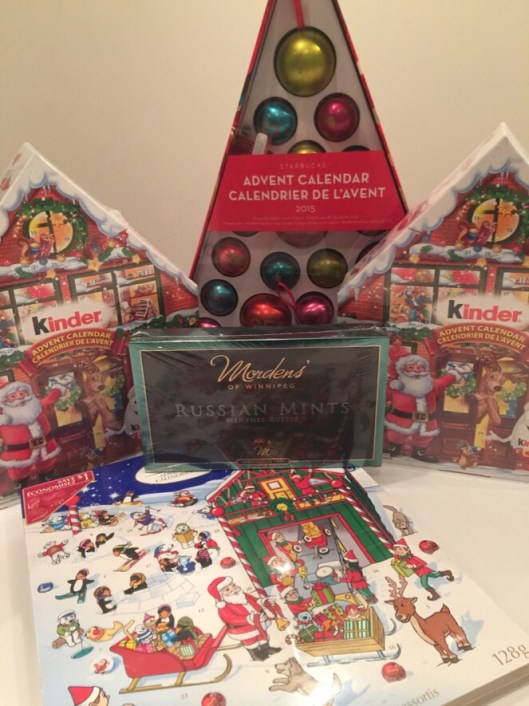 yesterday I sent home Advent calendars for everyone… there was a Starbucks one for my daughter… Kinder Surprise ones for the little boys… a Lindt one for the oldest grandson, and a box of Russian Mints for my son-in-law…