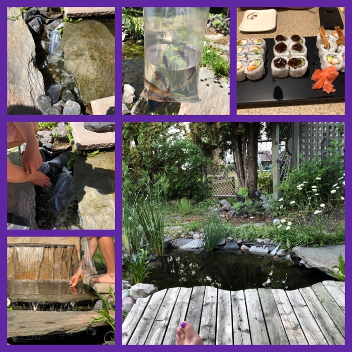 my grandson and I went out for sushi and then we picked up some goldfish and shubunkins for the pond, and a few more pond plants…