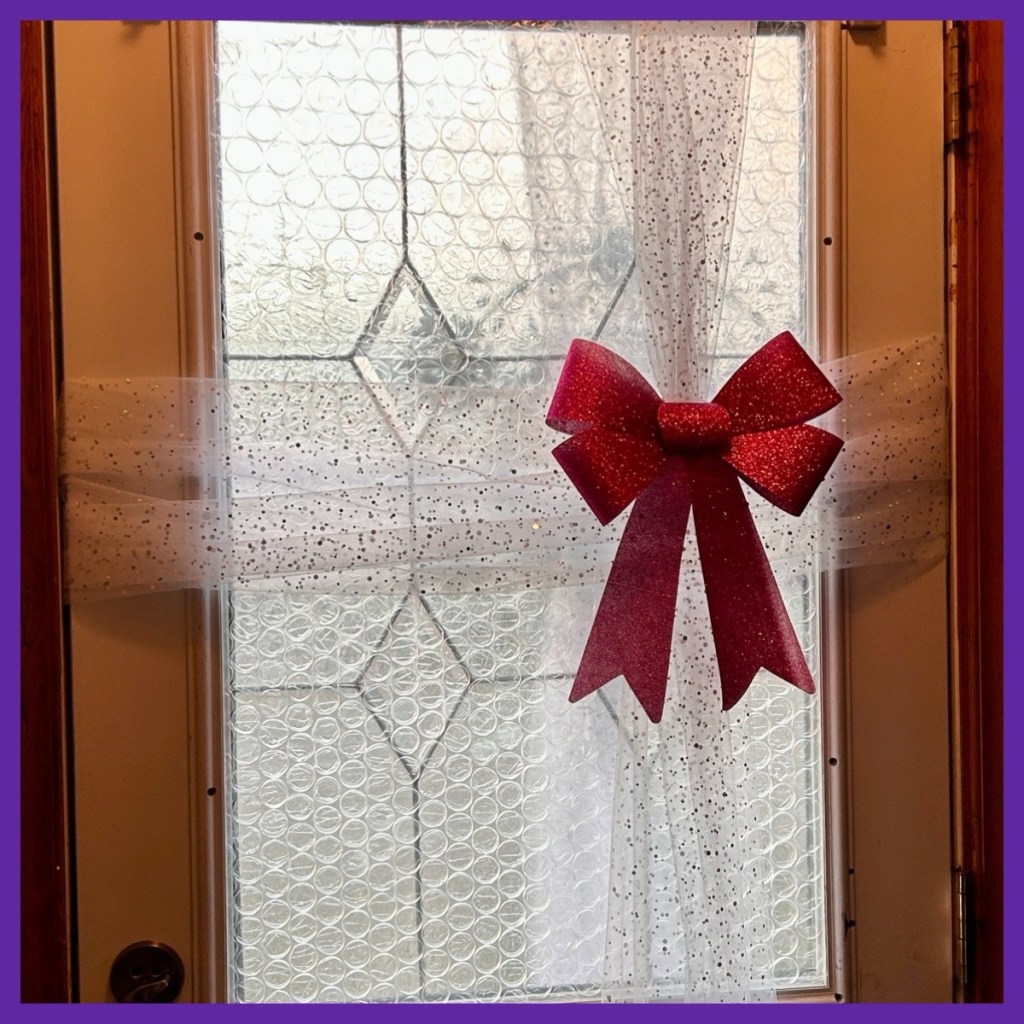 next I unwrapped the glittery tulle and figured out how much I needed… I tied it but with the knot on the inside of the door and I realized it needed to be on the outside, so I undid it and then redid it the other way…
