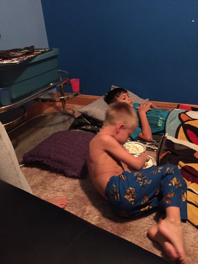 snack of popcorn and a bit of tv before bedtime for the two littlest, with the other one ensconced in the basement…